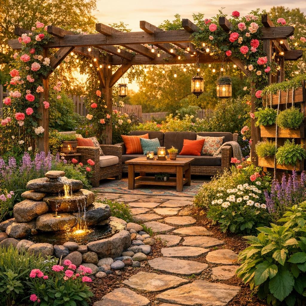 Ein kleiner Teich mit Solarbeleuchtung sorgt abends für stimmungsvolle Akzente. DIY-Windlichter aus recycelten Gläsern schaffen Gemütlichkeit.