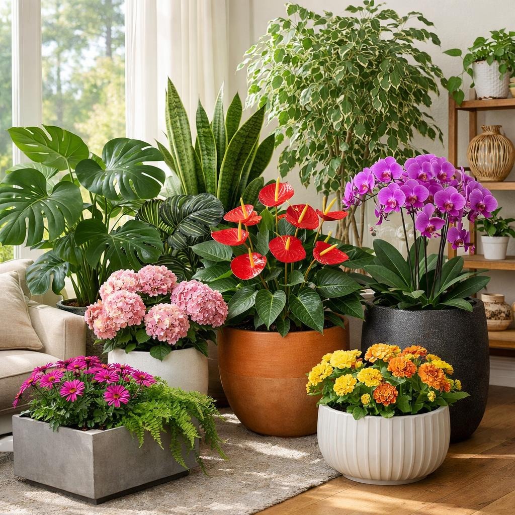 In städtischen Wohnungen schaffen Kombinationen aus Grünpflanzen und blühenden Arten eine natürliche Oase. Zum Beispiel ergänzen sich Monstera, Philodendron und Orchideen mit ihren unterschiedlichen Blattformen und Blütenfarben. Diese Mischung wirkt modern und lebendig.