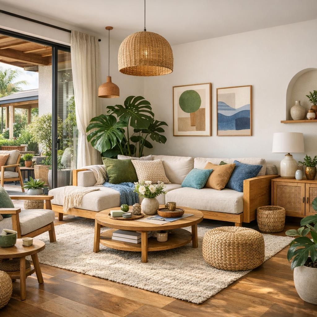 - Natürliche Materialien wie Holz, Rattan und Bambus dominieren und fördern ein nachhaltiges Wohngefühl.